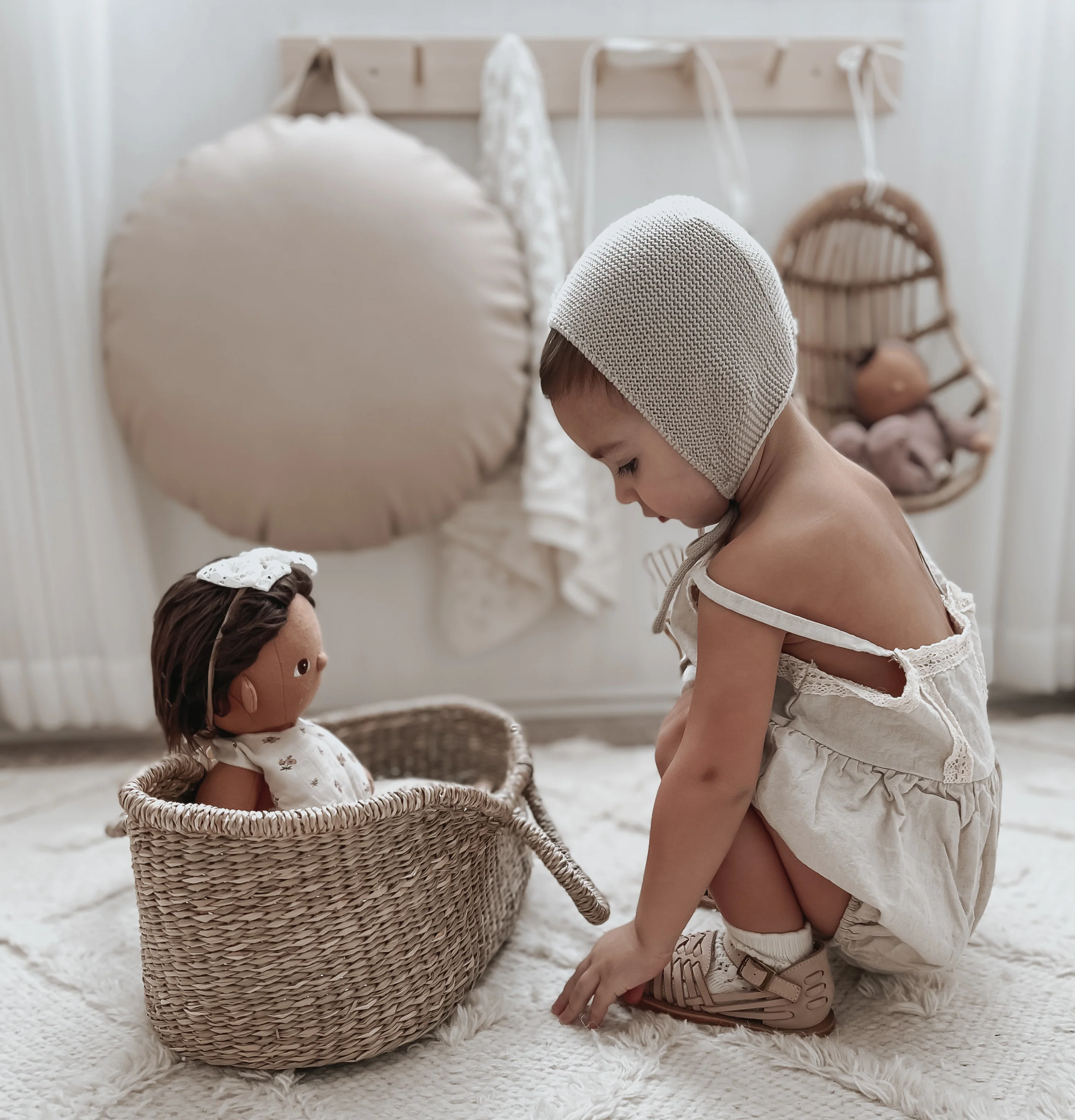 Dolly is a baby doll Moses basket made in organic and sustainable seagrass. The baby doll basket includes a luxurious hand stitched cotton mattress to keep dolls and teddies snug.